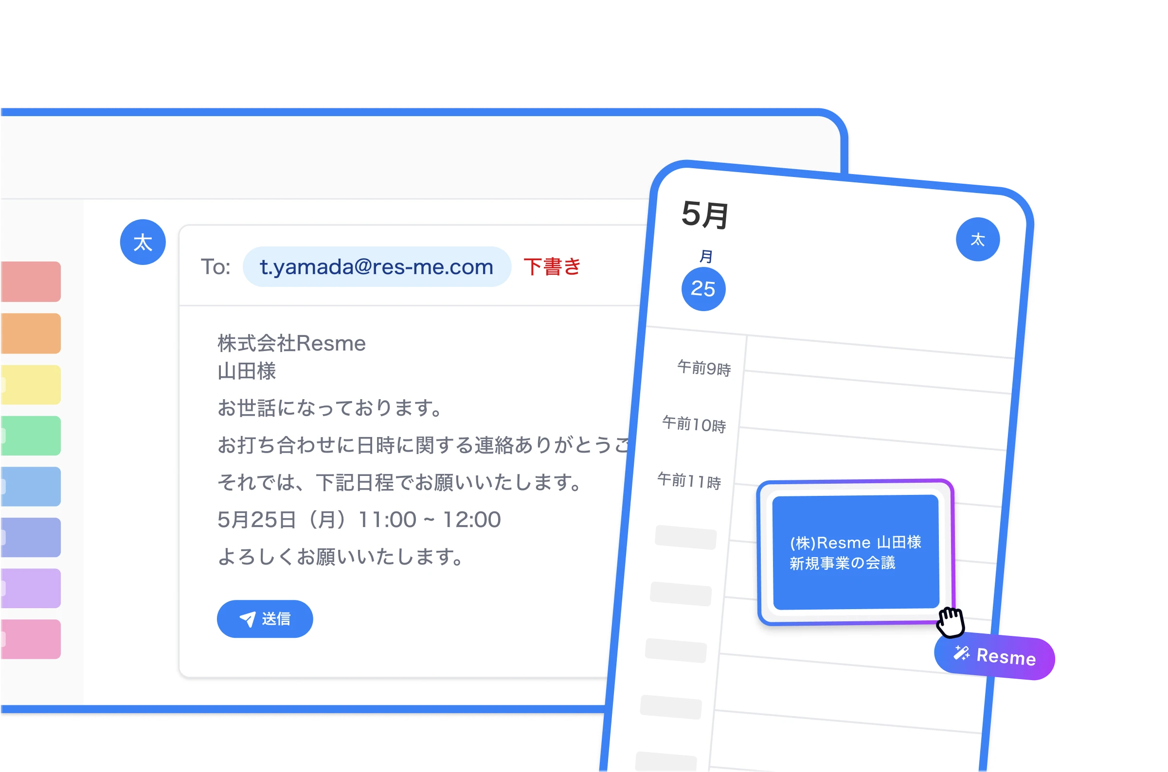 会議の予定についてメールで言及された際には、カレンダーを自動で確認し、候補日の提案、確定したのちにはカレンダーアプリへの登録も自動で行います。