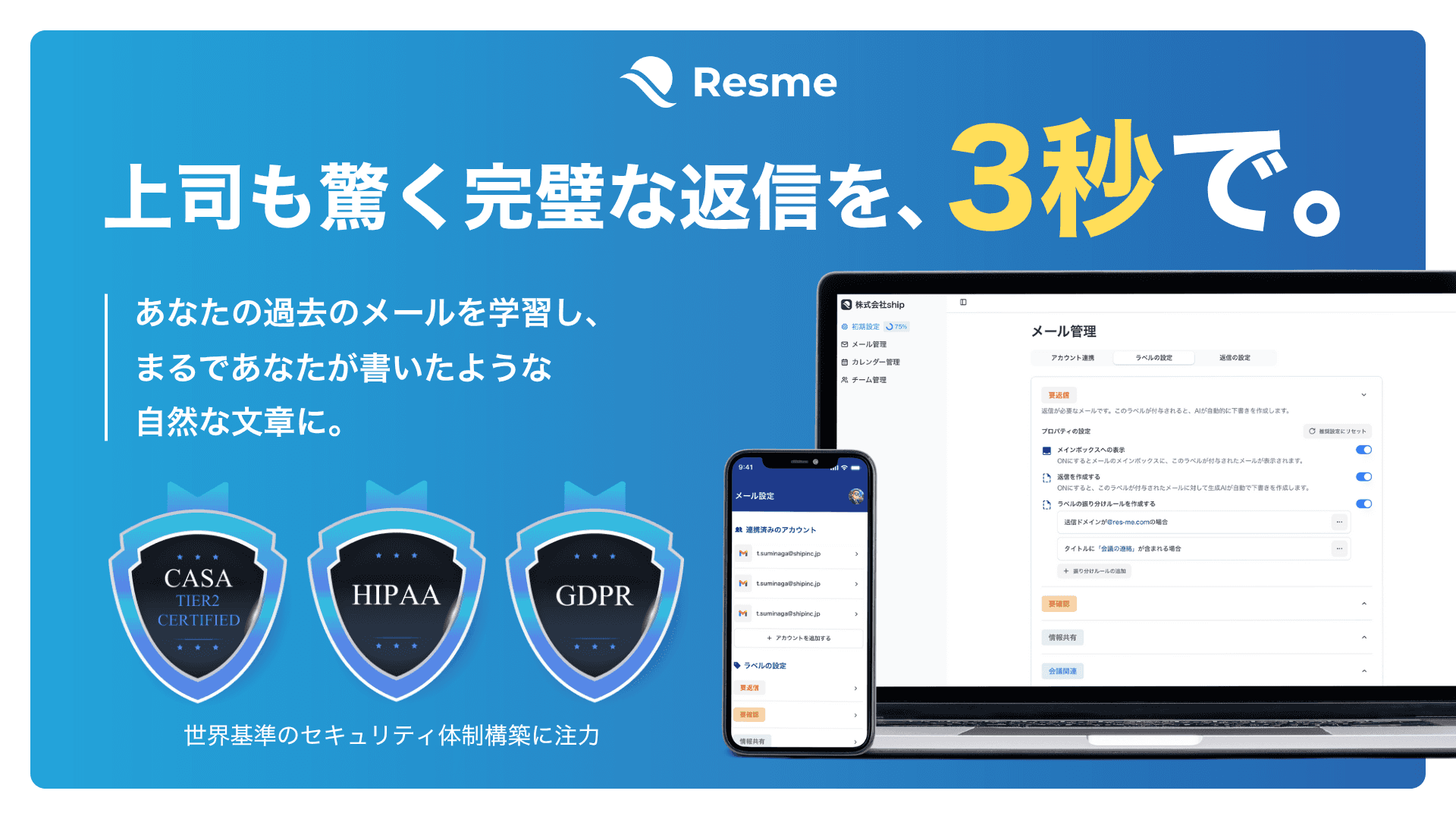 レスミーの中で取り扱う情報資産はお客様の貴重な情報であり、当社の経営基盤として極めて重要なものです。レスミーではGDPRやHIPAAなどの基準に基づくなど、世界基準のセキュリティ体制構築に注力しています。